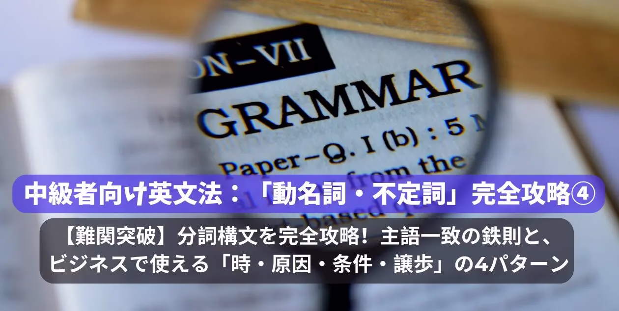 中級者向け英文法:「動名詞・不定詞」完全攻略④|【難関突破】分詞構文を完全攻略!主語一致の鉄則と、ビジネスで使える「時・原因・条件・譲歩」の4パターン