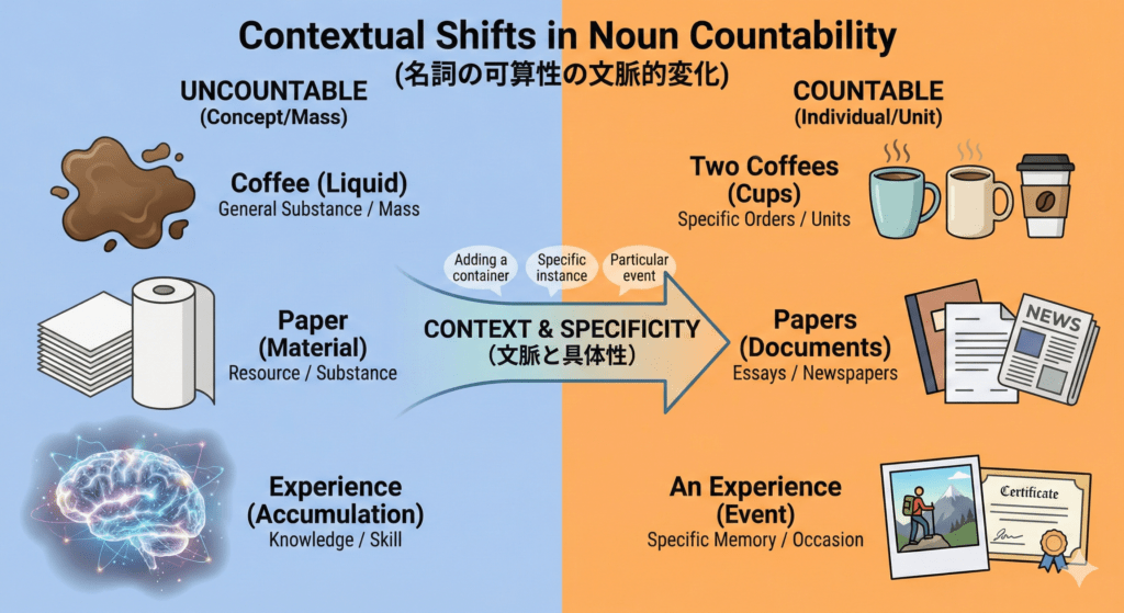 - 「文脈の力」を信じる 同じ単語でも、場面によって可算・不可算は変わる。「例外」を恐れず、その場の柔軟性を楽しむ。