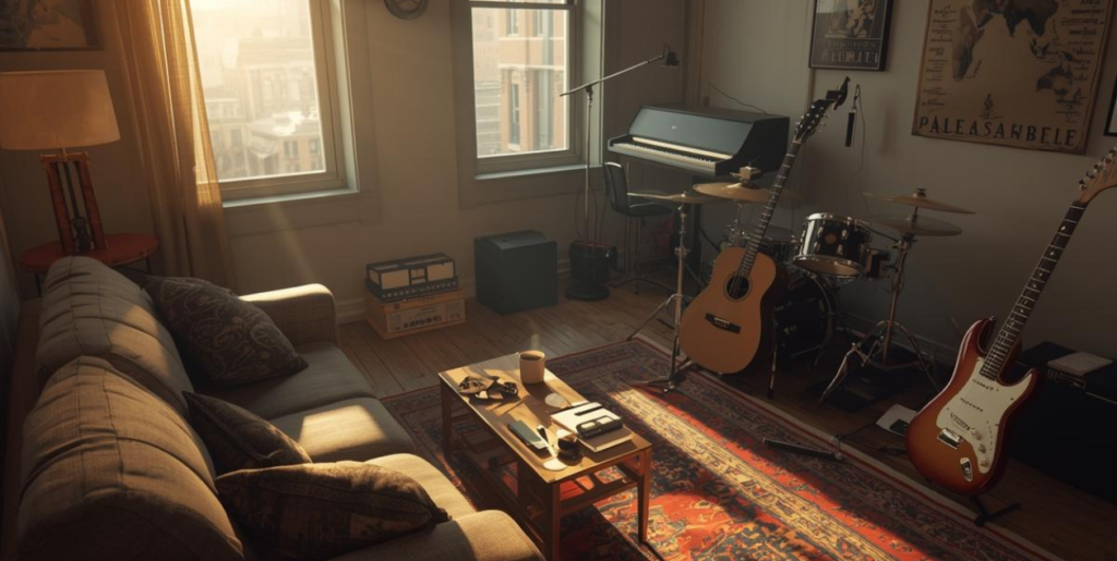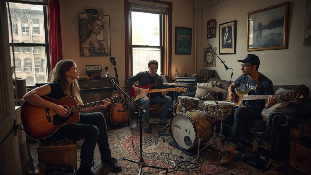 The afternoon sun streamed through the tall windows of a cozy apartment in Brooklyn. Three twenty-something musicians sat around a worn-out couch, surrounded by guitars, notebooks, and empty coffee cups. This was “The Harmony House”—a shared apartment where aspiring musicians lived together, chasing their dreams of making it big in the music industry.